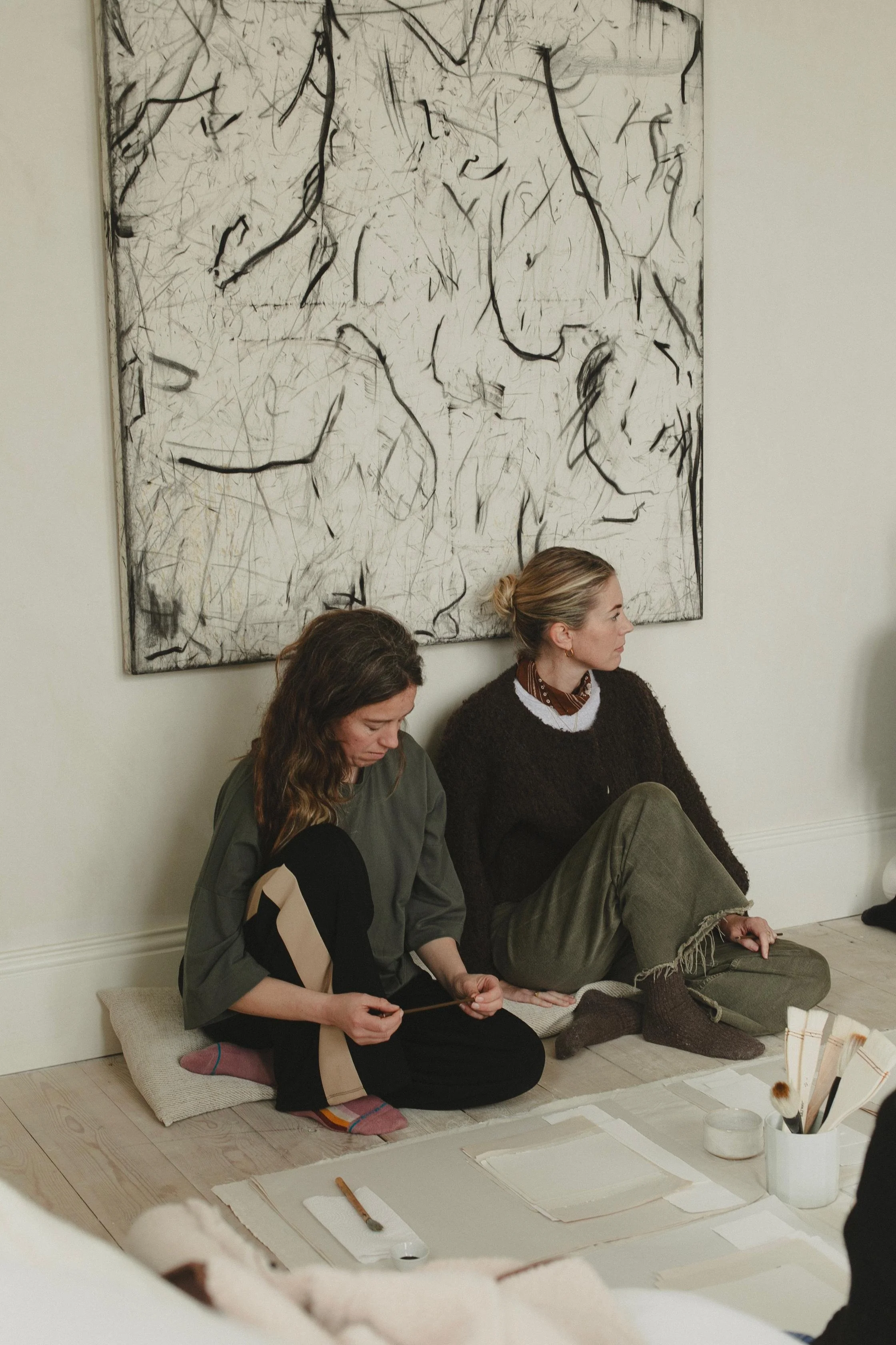 The mark-making practices in our workshops offer the creative act as a way to ‘be-with’ ourselves, as a stroke of ink unfolds and expresses what is within. Rather than being a practice of mastering a technique or producing a perfect brushstroke, they are an invitation to be present with what arises; to explore the edges of ambiguity and uncertainty, and to notice the ways in which we resist or flow in response to it.